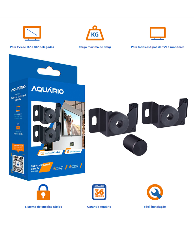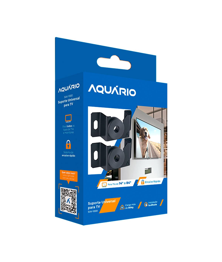 Fixe sua TV com segurança, conheça a nova linha da Aquário! Por ser Universal, qualquer modelo de TV que pode ser fixado na parede pode receber este tipo de Suporte. O modelo mais em conta, com a função de segurar seu aparelho na parede sem realizar nenhum movimento. Lançamento Suporte para TV Universal 14 a 84"""" Referência: SAV-1000 Suporta televisores com tela LCD, LED, Plasma, Plana e Curva. Tamanhos de TV: 14 a 84 Polegadas. Padrões VESA suportados: 100x100 até 600x400. Peso total suportado: 80Kg contando Suporte TV. Distâncias da parede: Mín: 2,5cm. Máx: 3,5cm. Onde posso fixar meu suporte? Você pode perfurar e fixar o suporte em qualquer parede de alvenaria ou concreto com total segurança. Em painéis de madeira e paredes Dry Wall você precisa verificar se são resistentes o suficiente pra suportar o peso total. Para alguns casos, até mesmo paredes grossas de gesso tem capacidade de manter os equipamentos presos. Acessórios que acompanham o produto O suporte acompanha alguns tipos de parafusos, buchas e arruelas para auxiliar a sua instalação. Seja para uma instalação em parede de alvenaria ou então para paineis de madeira, você terá as opções corretas. Os fixadores do suporte são produzidos para se adequar a grande maioria dos encaixes das TVs mais vendidas no mercado. Calço para manter a TV em posição reta, sem inclinar nem balançar o conjunto. Manual de instruções e instalação. Com fácil instalação, após fixar os parafusos na parede, basta plugar os dois suportes e encaixar a TV no lugar. Para evitar acidentes, antes de soltar o produto, teste e se certifique que o conjunto está bem encaixado e preso. ESPECIFICAÇÕES: CÓDIGO DO PRODUTO: SAV-1000 POLEGADAS SUPORTADA: 14 a 84"""" LOCAIS DE INSTALAÇÃO: Parede alvenaria, Drywall, Madeira MATERIAL: Aço Carbono com pintura resistente, epóxi eletrostática (anticorrosiva) DISTÂNCIA MÍNIMA DA PAREDE: 2,5cm DISTÂNCIA MÁXIMA DA PAREDE: 3,5cm PESO MÁXIMO SUPORTADO: 80 Kg PESO DO PRODUTO: 0,2 Kg