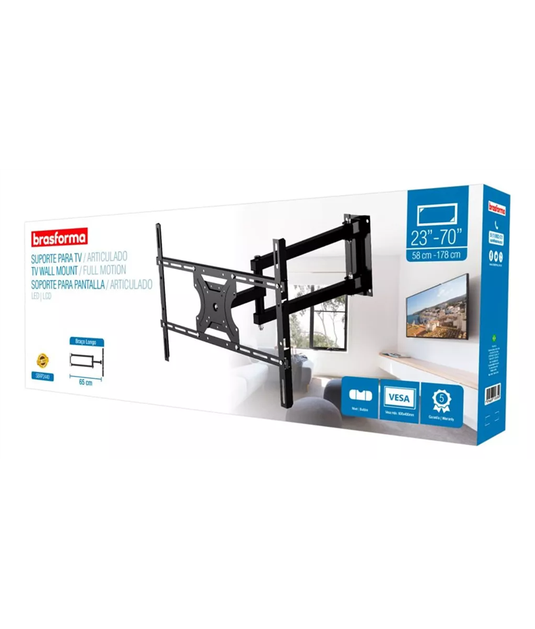 Suporte Articulável Brasforma para TV?s de 23 até 70 polegadas (com VESA máximo de 600x400mm). Permite articulação e inclinação (4 movimentos), permitindo assistir a TV em diversos ângulos. Ideal para salas, escritórios, quartos, hospitais, restaurantes, ou qualquer local onde a TV necessite de movimentos. Acompanha Nível Bolha!