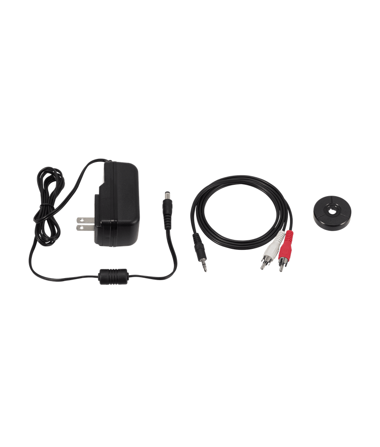 Inclui: cabo de saída RCA removível (macho de 3,5 mm para macho RCA duplo), adaptador de 45 RPM e capa contra poeira articulada removível