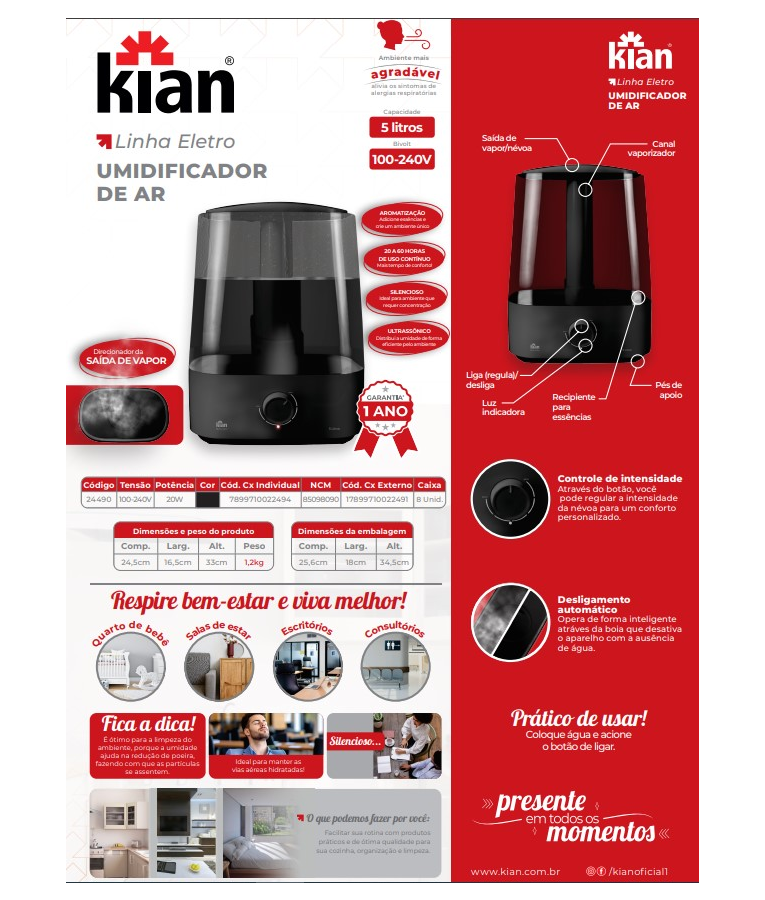 Além disso, o umidificador da Kian é Bivolt, proporcionando praticidade para ser utilizado em qualquer lugar, sem a preocupação com a voltagem. Cuide da sua saúde e bem-estar com mais conforto e qualidade de vida!